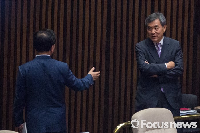 (서울=포커스뉴스) 김부겸(왼쪽) 더불어민주당 의원과 이상돈 국민의당 의원이 22일 오전 서울 여의도 국회에서 열린 본회의에 참석해 대화를 나누고 있다.