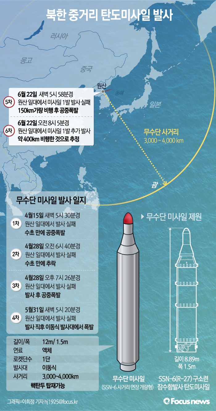 합동참모본부는 이날 "오늘 오전 5시58분쯤 북한이 원산일대에서 무수단으로 추정되는 미사일 1발을 발사했다"면서 "이어 8시5분쯤에는 북한이 원산일대에서 무수단으로 추정되는 미사일을 1발을 또 발사했다"고 밝혔다.