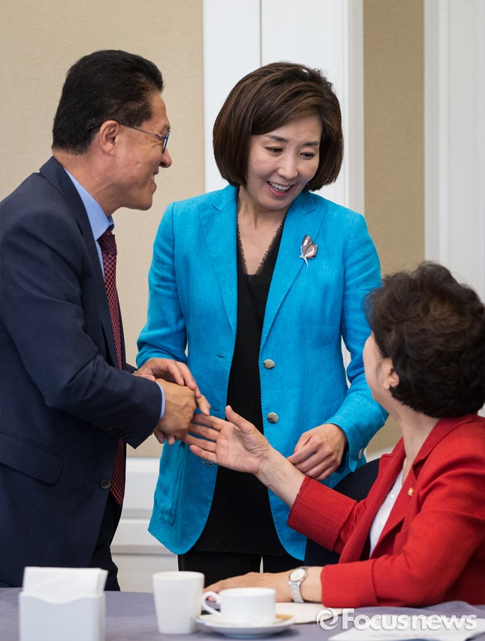 (서울=포커스뉴스)22일 오후 서울 여의도 국회에서 열린 비박계 새누리당 의원들이 주축이 된 '대한민국 미래혁신포럼' 창립 총회에서 나경원(가운데) 의원이 동료 의원들과 인사를 나누고 있다.