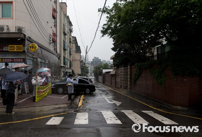(서울=포커스뉴스) 22일 오후 서울 중구 신당동 김종필 전 총리 자택 앞에서 일제 강제동원희생자유가족협동조합 및 아시아태평양 전쟁희생자 한국유족회 회원들이 '한일협정 당시 일본외상 오히라 와 메모로 합의한 역사의 진실을 밝힐 것'을 촉구하고 있다.