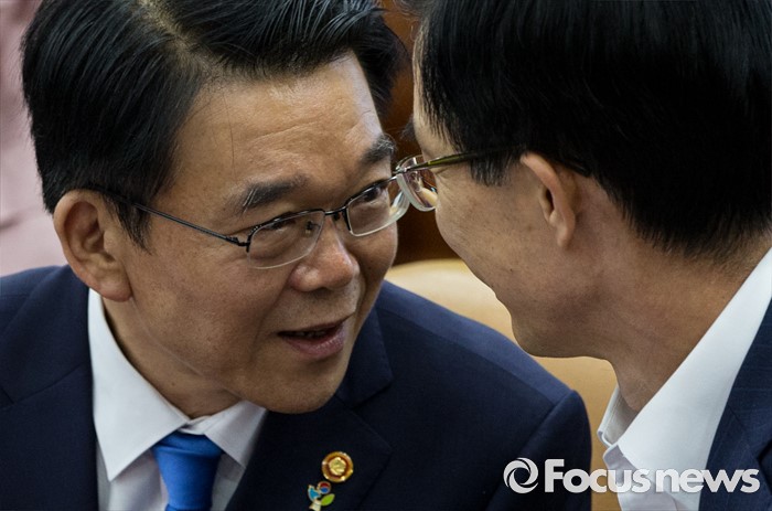 (서울=포커스뉴스) 22일 오후 서울 종로구 정부서울청사에서 열린 경제관계장관회의에 참석한 강호인(왼쪽) 국토교통부 장관과 방문규 보건복지부 차관이 대화하고 있다.
