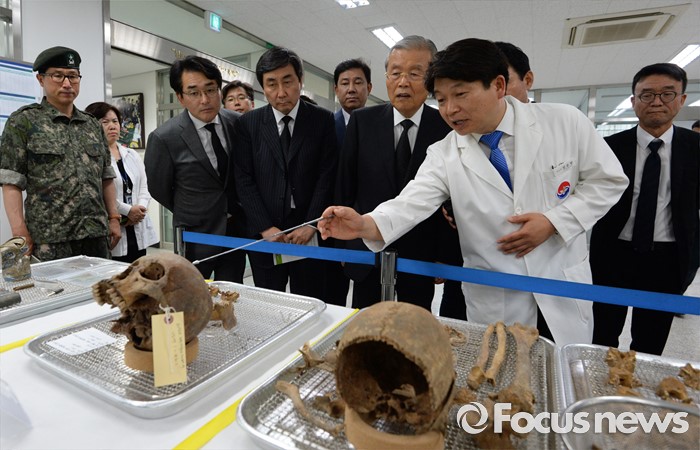 (서울=포커스뉴스) 김종인 더불어민주당 비대위 대표와 의원들이 22일 오후 서울 동작구 국립서울현충원 내 국방부 유해발굴감식단 중앙감식소를 방문해 감식 중인 유해를 살펴보고 있다.