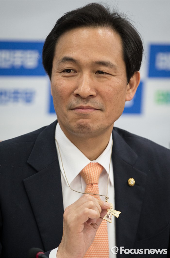(서울=포커스뉴스) 우상호 더불어민주당 원내대표가 22일 오후 서울 여의도 국회에서 열린 더불어민주당 세월호 TF 회의에서 세월호 참사 유가족이 만든 목걸이를 들어 보이고 있다.