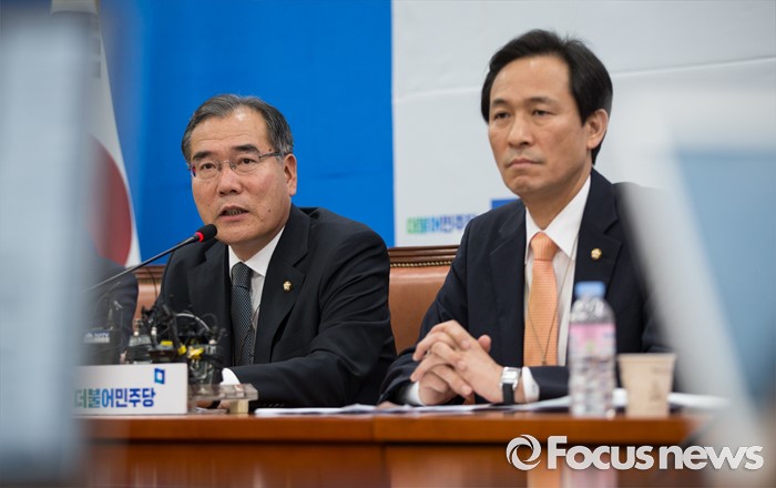 (서울=포커스뉴스) 이개호(왼쪽)더불어민주당의원이 22일 오후 서울 여의도 국회에서 열린 더불어민주당 세월호 TF 회의에 참석해 발언하고 있다.