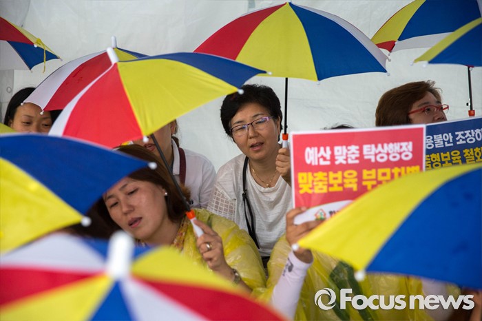 (서울=포커스뉴스) 22일 오후 서울 여의도 산업은행 본점 후문에서 한국가정어린이집연합회 비대위가 주최하는 '맞춤형 복지 시행 반대 단식 농성'이 열리고 있다.