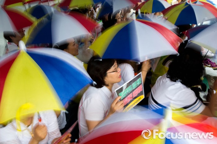 (서울=포커스뉴스) 22일 오후 서울 여의도 산업은행 본점 후문에서 한국가정어린이집연합회 비대위가 주최하는 '맞춤형 복지 시행 반대 단식 농성'이 열리고 있다.