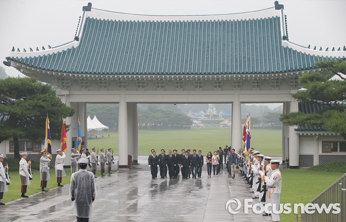 (서울=포커스뉴스) 김종인 더불어민주당 비대위 대표와 의원들이 22일 오후 서울 동작구 국립서울현충원 내 국방부 유해발굴감식단 방문에 앞서 현충탑 참배를 위해 이동하고 있다.