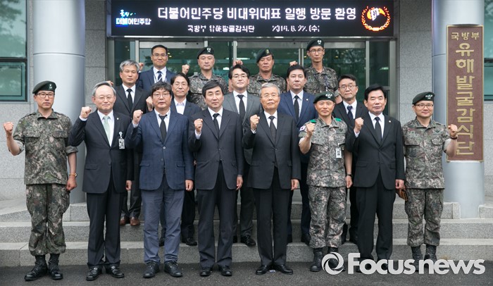 김 대표는 앞서 지난 8일 야당 대표로서는 처음으로 합동참모본부를 방문하는 등 안보 행보에 적극적으로 나서고 있다. 경제민주화와 포용적 성장을 내세운 '경제 정당' 이미지에 이어 '안보' 이슈 선점도 놓치지 않으려는 전략이다.김종인 더불어민주당 비대위 대표 등 의원들이 22일 오후 서울 동작구 국립서울현충원 내 국방부 유해발굴감식단을 방문해 이학기 단장 등 관계자들과 기념촬영을 하고 있다. 2016.06.22 박동욱 기자