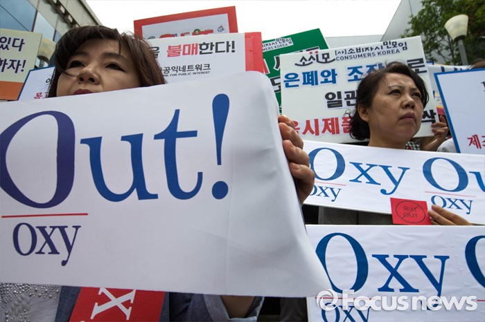 검찰은 거라브 제인 전 대표 등에 대한 조사에 속도를 낸 뒤 이달 말 쯤 5개월간의 수사 결과를 발표할 예정이다.13일 오전 서울 용산구 롯데마트 서울역점 앞에서 소비자단체 회원들이 롯데마트의 자사 가습기 살균제품 피해에 대한 책임있는 행동을 촉구하고 옥시 제품 판매 중단을 요구하는 집회를 하고 있다. 2016.06.13 성동훈 기자