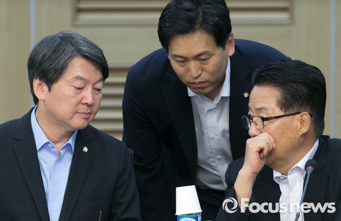 (서울=포커스뉴스) 23일 오전 서울 여의도 국회에서 열린 국민의당 19차 정책역량강화 워크숍에 참석한 안철수(왼쪽부터) 상임공동대표, 손금주 대변인, 박지원 원내대표가 대화하고 있다.