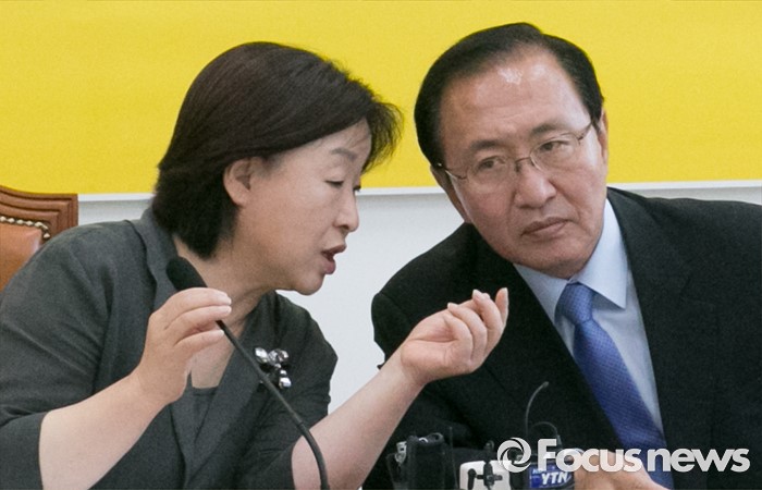 (서울=포커스뉴스) 심상정(왼쪽) 정의당 상임대표와 노회찬 원내대표가 23일 오전 서울 여의도 국회에서 상무위원회에 앞서 정부 맞춤형 보육 시행반대 피켓 퍼포먼스를 마친 뒤 대화하고 있다.