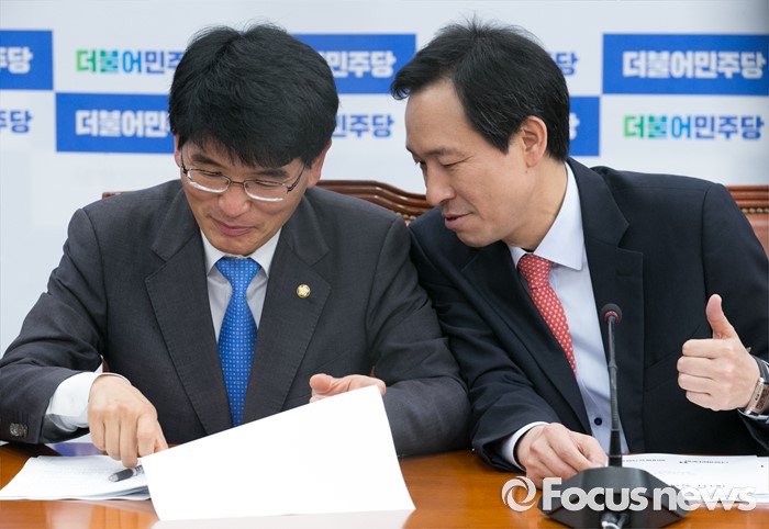 (서울=포커스뉴스) 우상호(오른쪽) 더불어민주당 원내대표와 박완주 원내수석부대표가 23일 오전 서울 여의도 국회에서 열린 정책조정회의에 참석해 대화하고 있다.