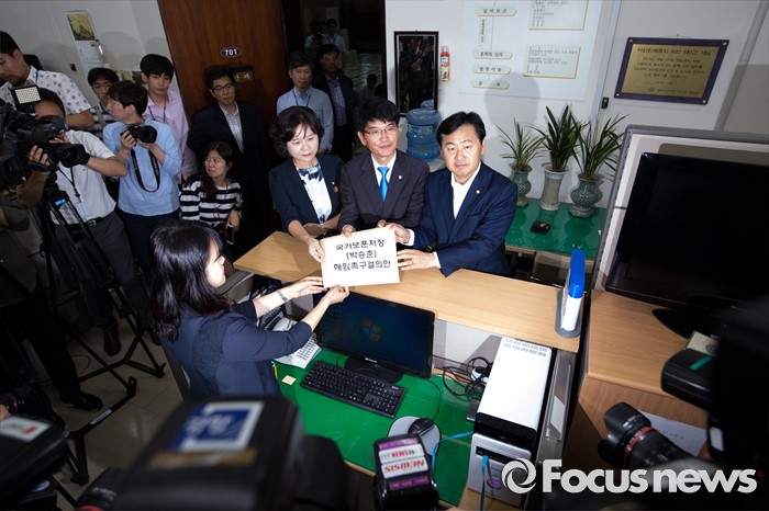 (서울=포커스뉴스) 야3당 원내수석부대표들이 23일 오전 서울 여의도 국회 의안과에서 박승춘 국가보훈처장 해임촉구결의안을 전달 하고 있다. 왼쪽부터 이정미 정의당 원내수석부대표, 박완주 더불어민주당 원내수석부대표, 김관영 국민의당 원내수석부대표.