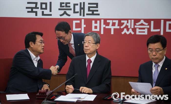 (서울=포커스뉴스) 정진석(왼쪽) 새누리당 원내대표가 23일 오전 서울 여의도 새누리당 당사에서 열린 혁신비상대책위원회 회의에서 김도읍(왼쪽 두번째) 원내수석부대표와 인사를 나누며 대화하고 있다. 오른쪽 두번째는 김희옥 혁신비대위원장.