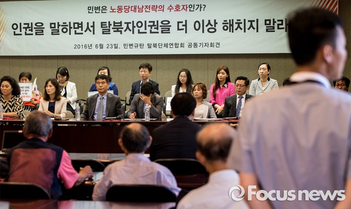 (서울=포커스뉴스) 23일 오전 서울 중구 프레스센터에서 탈북민단체연합 회원들이 '12명 탈북민들을 사지로 내모는 민변 규탄 및 고발' 기자회견을 갖고 있다.