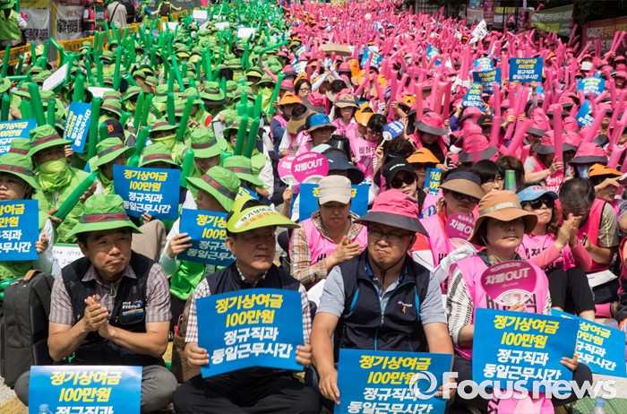 (서울=포커스뉴스) 23일 오전 서울 종로구 서울시 교육청 인근에서 전국학교비정규직 노동조합원과 공공운수노조 전국 교육공무직 본부원들이 '학교급식 인원보강 및 처우개선 철야대기 학교비정규직 처우개선 임단협 승리 총파업 결의대회' 를 하고 있다.