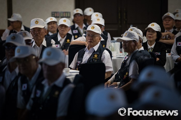 (서울=포커스뉴스) 23일 오전 서울 용산구 전쟁기념관 뮤지엄 웨딩홀에서 참전유공자들이 '6.25전쟁 참전유공자 위로연 및 호국영웅기장 전수식'에 참석하고 있다.