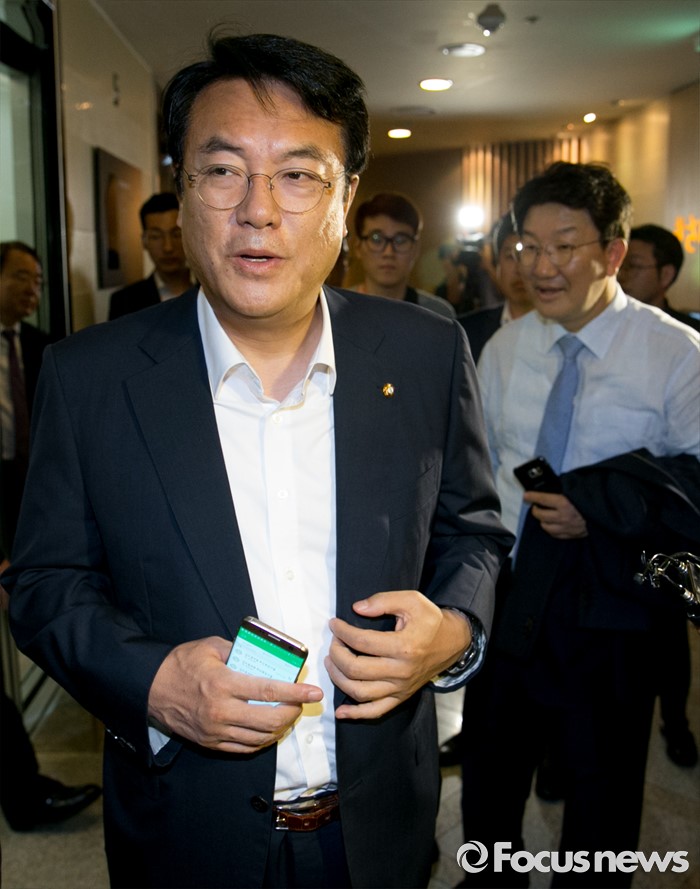 (서울=포커스뉴스) 정진석(왼쪽) 새누리당 원내대표, 사무총장직을 사퇴한 권성동 의원이 23일 오후 서울 여의도 한 음식점에서 진행된 비상대책위원들과의 오찬 모임에 참석하고 있다.