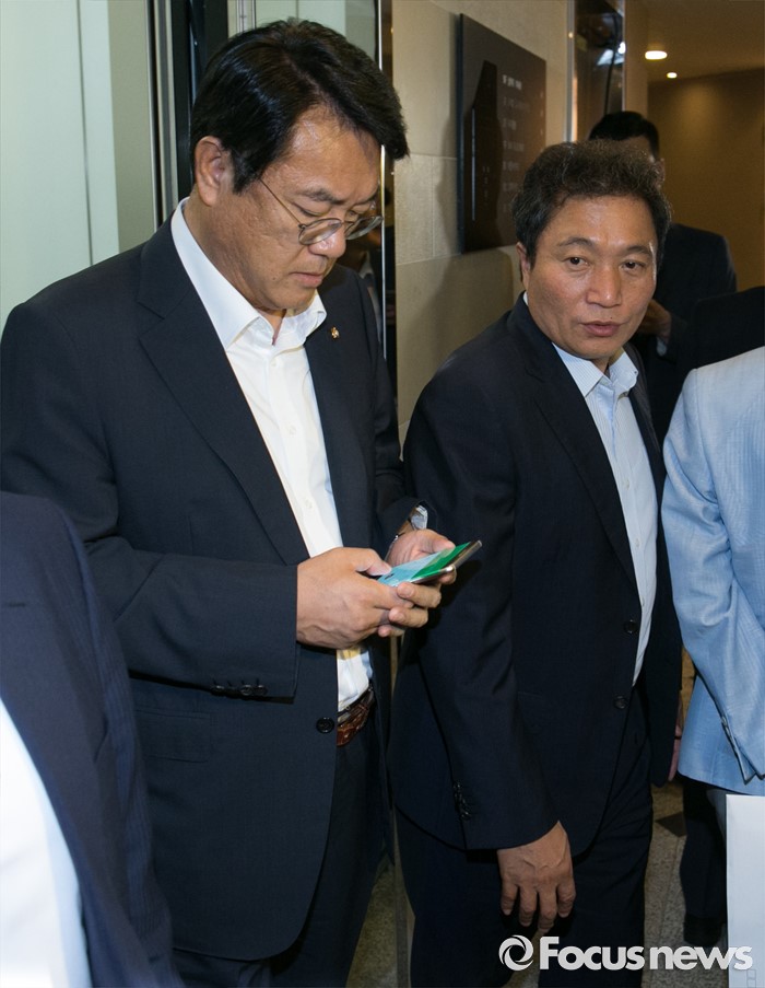 (서울=포커스뉴스) 정진석(왼쪽) 새누리당 원내대표와 이학재 비대위원이 23일 오후 서울 여의도 한 음식점에서 진행된 비상대책위원들과의 오찬 모임에 참석하고 있다.