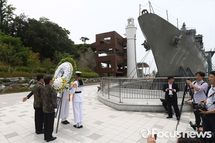 (서울=포커스뉴스) 안철수 국민의당 상임공동대표, 박지원 원내대표가 23일 오전 경기도 평택 해군 제2함대 사령부를 방문해 천안함 앞에서 헌화를 하고 있다.