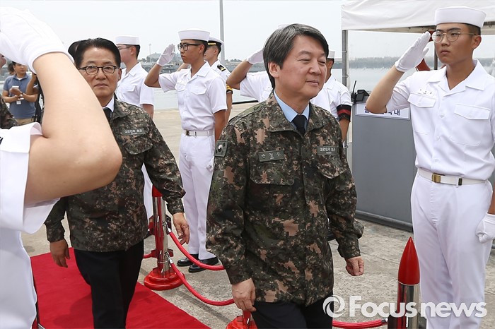 (서울=포커스뉴스) 안철수 국민의당 상임공동대표, 박지원 원내대표 등 의원들이 23일 오전 경기도 평택 해군 제2함대 사령부를 방문해 병영식 체험을 위해 제천함에 오르고 있다.