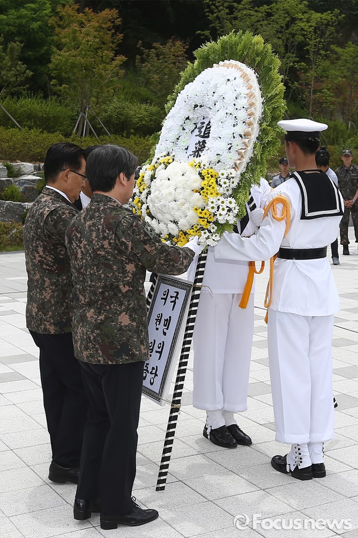 (서울=포커스뉴스) 안철수 국민의당 상임공동대표, 박지원 원내대표가 23일 오전 경기도 평택 해군 제2함대 사령부를 방문해 천안함 앞에서 헌화를 하고 있다.