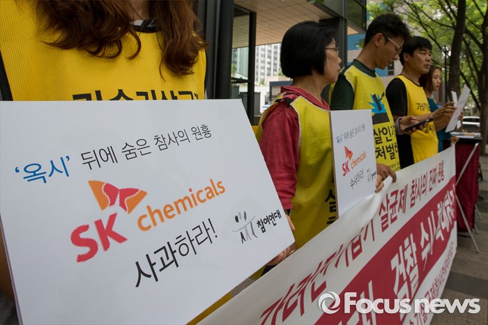 (서울=포커스뉴스) 23일 오후 서울 종로구 SK 본사 앞에서 열린 'SK케미칼 규탄 및 책임자 수사 촉구' 기자회견에서 가습기살균제참사전국네트워크 회원들이 SK케미칼을 규탄하는 손팻말을 들고 있다.