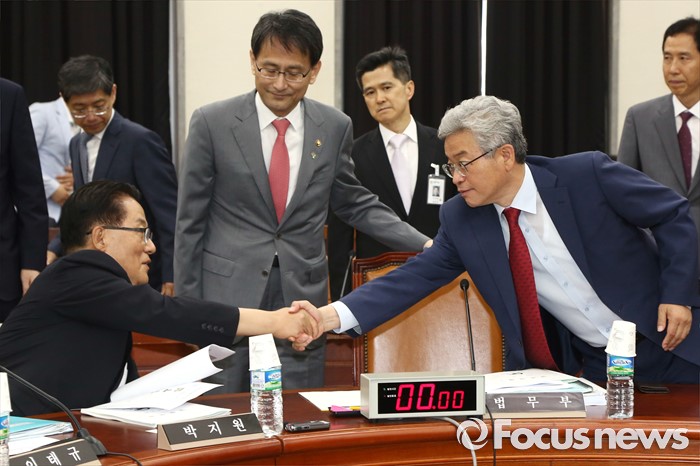 (서울=포커스뉴스) 23일 오후 서울 여의도 국회에서 열린 정보위원회 전체회의에 참석한 이철우(오른쪽) 위원장과 박지원 국민의당 원내대표가 인사하고 있다.