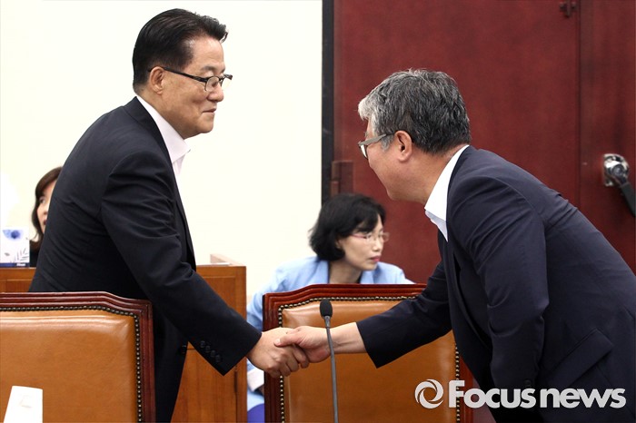 (서울=포커스뉴스) 23일 오후 서울 여의도 국회에서 열린 정보위원회 전체회의에 참석한 조응천(오른쪽) 더불어민주당 의원과 박지원 국민의당 원내대표가 인사하고 있다.