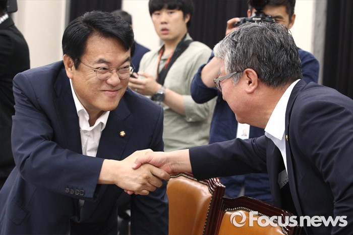 (서울=포커스뉴스) 23일 오후 서울 여의도 국회에서 열린 정보위원회 전체회의에 참석한 정진석(왼쪽) 새누리당 원내대표와 조응천 더불어민주당 의원이 인사하고 있다.
