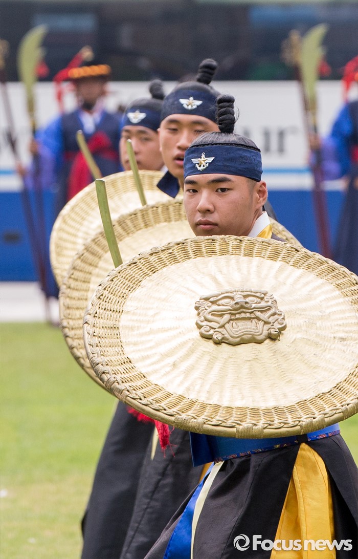 서울=포커스뉴스) 23일 오후 서울광장에서 열린 '왕궁수문장 20주년 기념행사'에 참석한 국방부 전통의장대원들이 무예 시범을 보이고 있다.