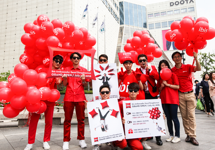 이비스 앰배서더 서울 동대문 직원들은 호텔을 상징하는 빨간색 의상을 입고 동대문 패션타운 일대에서 여행객들과 시민들을 대상으로 오픈을 알리는 거리 이벤트를 진행하고 있다.