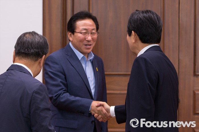 (서울=포커스뉴스) 정세균(오른쪽) 국회의장이 23일 오후 서울 여의도 국회에서 민병희(가운데) 강원도교육감과 면담에 앞서 악수 하고 있다.