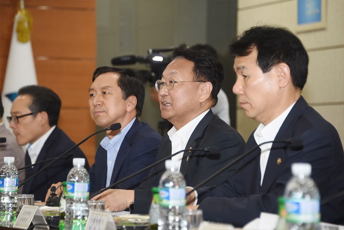 (울산=포커스뉴스) 유일호 부총리 겸 기획재정부 장관이 23일 구조조정 관련 현장방문으로 현대중공업 울산조선소에서 선박건조 현장을 둘러본 후 울산시청에서 유관기관 및 기업들과의 간담회를 갖고 있다. <사진제공=기획재정부>