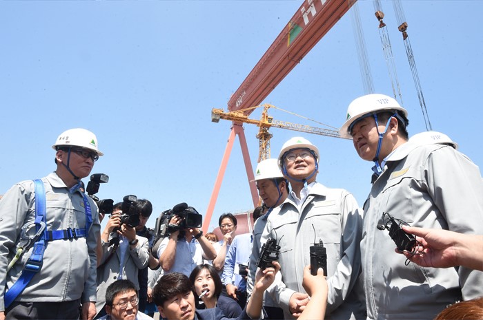 (울산=포커스뉴스) 유일호 부총리 겸 기획재정부 장관이 23일 구조조정 관련 현장방문으로 현대중공업 울산조선소에서 관계자로부터 선박건조 현장 설명을 듣고 있다. <사진제공=기획재정부>