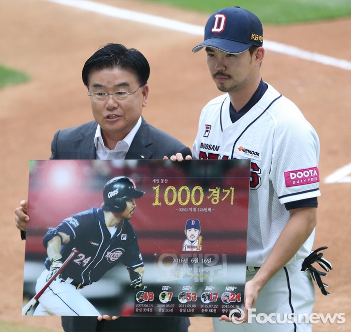 (서울=포커스뉴스) 23일 서울 잠실구장에서 열린 2016 프로야구 kt-두산 경기 개시에 앞서 두산 오재원의 1천 경기 출장 기념식을 갖고 김태룡 단장이 기념사진을 전달하고 있다.