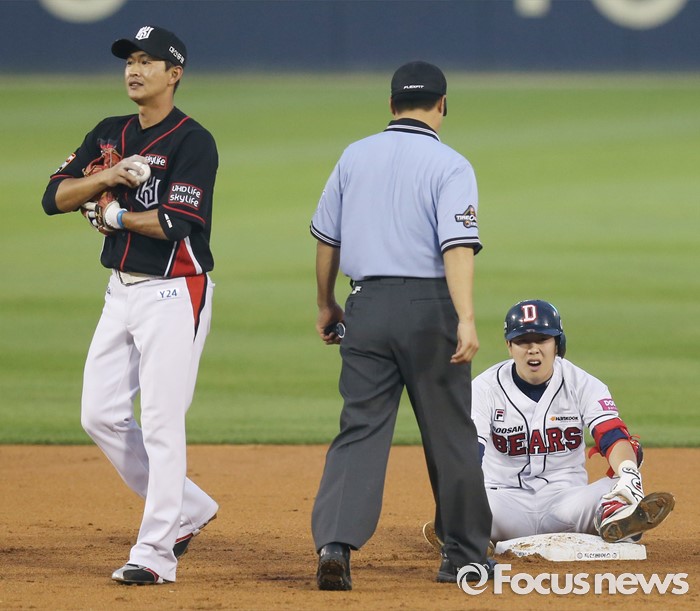 (서울=포커스뉴스) 23일 서울 잠실구장에서 열린 2016 프로야구 kt-두산 경기 3회말 1사 1루에서 두산 박건우가 주자를 불러 들이는 우중간 2루타를 치고 주루플레이 실수로 2루에서 태그아웃되고 베이스에 주저앉아 있다.