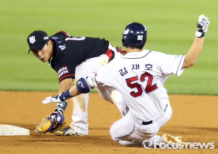 (서울=포커스뉴스) 23일 서울 잠실구장에서 열린 2016 프로야구 kt-두산 경기 7회말 두산 김재호가 좌익수 왼쪽으로 빠지는 안타를 치고 2루까지 달리다 kt 2루수 박경수에게 태그아웃되고 있다.