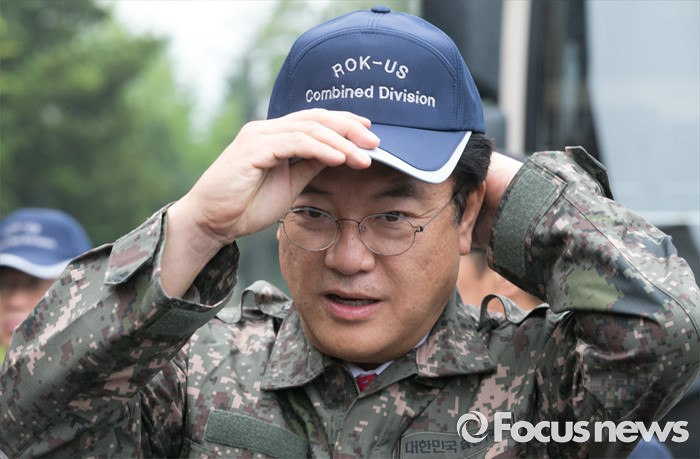 (의정부=포커스뉴스) 정진석 새누리당 원내대표가 24일 오전 경기도 의정부 미2사단 한미연합사단을 방문해 군용 모자를 쓰고 있다.