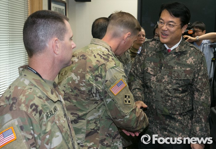 (의정부=포커스뉴스) 정진석 새누리당 원내대표가 24일 오전 경기도 의정부 미2사단 한미연합사단을 방문해 군 관계자들과 인사하고 있다.