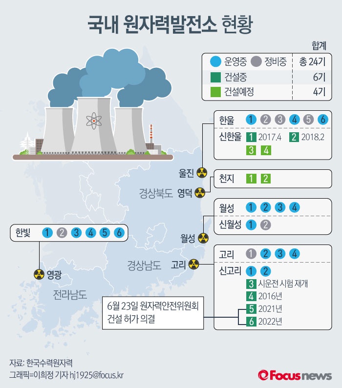 (서울=포커스뉴스) 원자력안전위원회는 23일 개최된 원자력안전위원회에서 '신고리 5,6호기 건설안'을 허가했다고 밝혔다. 국내 원자력발전은 현재 건설 중인 원전을 포함해 모두 30기로 늘어났다.