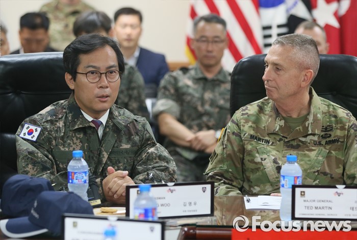 (의정부=포커스뉴스) 김영우 국회 국방위원장이 24일 오전 경기도 의정부 미2사단 한미연합사단을 방문해 부대현황 보고에 앞서 인사말을 하고 있다. 오른쪽은 테드 마틴 미2사단장.