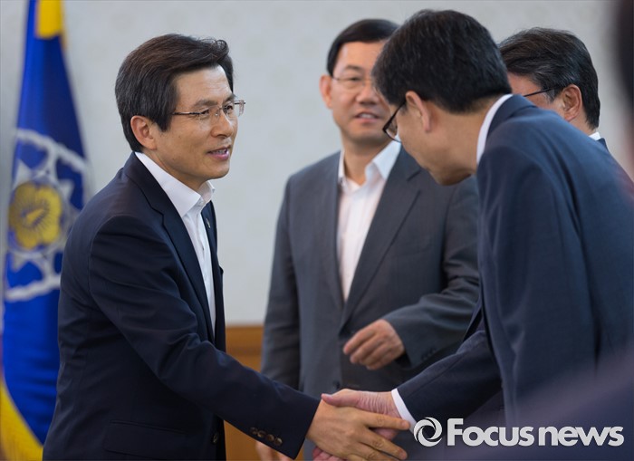 (서울=포커스뉴스) 황교안 국무총리와 대구지역 국회의원들이 24일 오후 서울 종로구 정부서울청사에서 영남권 신공항 백지화 관련 면담 전 인사하고 있다.