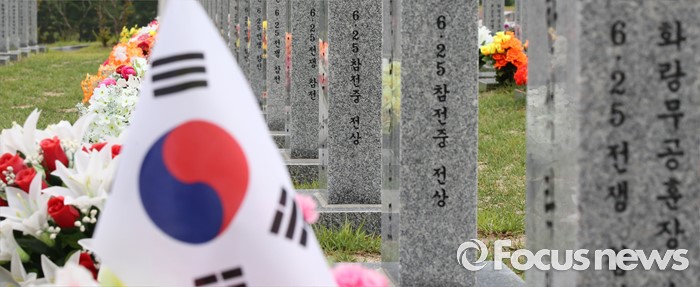(대전=포커스뉴스) 6·25전쟁 66주년을 하루 앞둔 24일 오후 대전 유성구 국립대전현충원 6.25 전쟁 참전 용사의 묘비 앞에 태극기가 바람에 휘날리고 있다.