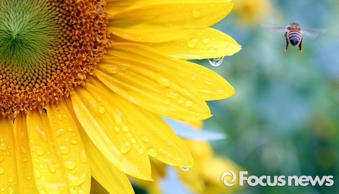 (대전=포커스뉴스) 장마가 소강상태를 보인 24일 오후 대전 유성구 국립대전현충원 보훈동산에 핀 해바라기 잎에 빗물이 맺혀 있다.