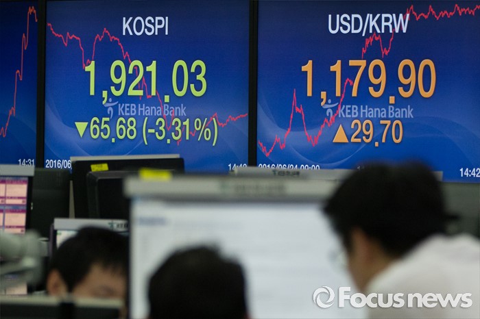 (서울=포커스뉴스) 영국의 유럽연합(EU) 탈퇴를 의미하는 '브렉시트'가 확정된 가운데 24일 오후 서울 중구 KEB 하나은행 명동 본점 딜링룸에서 딜러들이 업무를 보고 있다. 이날 코스피는 전날 대비 61.47p(3.09%) 내린 1,925.24, 코스닥은 32.36p(4.76%) 내린 647.16, 환율은 29.7원 오른 1,179.9원을 기록하며 장을 마감했다.