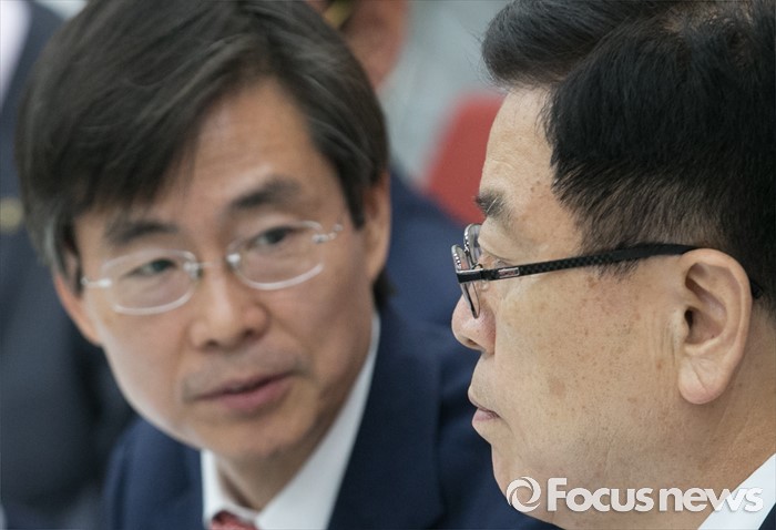 (서울=포커스뉴스) 24일 오후 서울 여의도 국회에서 열린 새누리당 브렉시트(Brexit) 관련 긴급현안 점검회의에 참석한 김광림(오른쪽) 정책위의장과 조경태 기획재정위원장이 대화하고 있다.