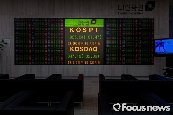 (서울=포커스뉴스) 코스피 지수가 브렉시트(영국 유럽연합 탈퇴) 충격에 전 거래일보다 61.47포인트(3.09%) 하락한 1,925.24에 거래를 마친 24일 오후 서울 영등포구 대신증권 객장 전광판에 국내증시가 표시되고 있다. 이날 코스닥 시장은 브렉시트 투표 여파로 한때 사이트카가 발동되었으며 전 거래일보다 32.36포인트(4.76%) 내린 647.16으로 장을 마감했다.