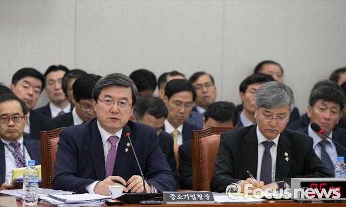 (서울=포커스뉴스) 24일 오후 서울 여의도 국회에서 열린 산업통상자원위원회 전체회의에 참석한 주영섭 중소기업청장이 의원들의 질의에 답하고 있다. 오른쪽은 최동규 특허청장.