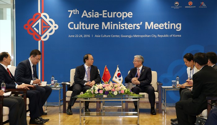 (광주=포커스뉴스) 김종덕 문화체육관광부 장관이 23일 제7차 ASEM 문화장관회의가 열리고 있는 광주시 동구 국립아시아문화전당에서 딩웨이(丁偉, Ding Wei) 중국 문화부 차관과 접견을 하고 있다. <사진제공=문화체육관광부>